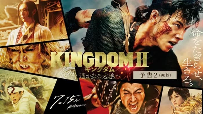 فیلم خارجی Kingdom 2: Far and Away 2022 در تاریخ 11 جولای 2022 در کشور ژاپن توسط کمپانی بزرگ سونی پیکچرز به اکران عمومی رسید. این فیلم در مجموع توانست در اکران داخلی و جهانی خود فروش بیش از 35 میلیون دلاری را نیز به دست آورد که بعد از آن نیز سونی پیکچرز حق پخش آن را در اینترنت به نتفلیکس همانند قسمت اول فروخت. در این فیلم هنرپیشگانی چون کنتو یامازاکی، ریو یوشیزاوا، کانا هاشیموتو، نانا سینو، شینوسوکه میتسوشیما، آمانه اوکایاما، تاکاهیرو میورا، تاکایوکی هاماتسو، توگی ماکابه به ایفای نقش پرداخته اند.